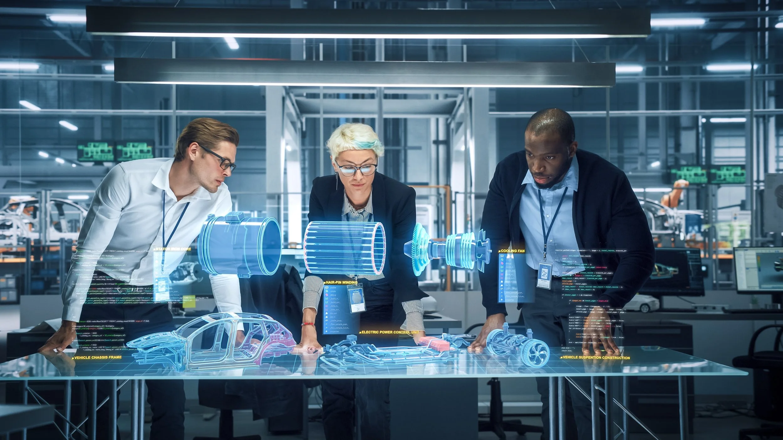 Engineers analyzing an AI digital twin of a car components in modern lab environment.